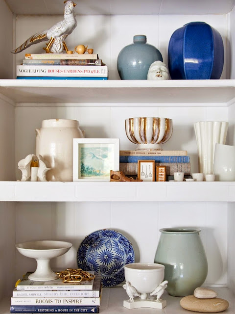 Another easy way to refresh your living room is to RESTYLE YOUR SHELVES. If you have some sort of bookcase or display shelving in your living area, or even a console table, consider a complete change of the items you have on display. Instead of the current trend of displaying a variety of items in a stylish way as in the picture below....